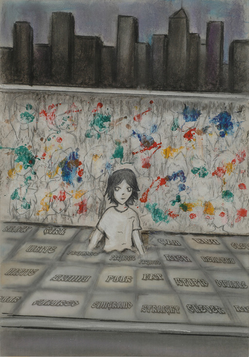 -ΧΡΙΣΤΙΝΑ-ΑΓΓΕΛΙΚΗ ΖΑΦΕΙΡΑΚΗ (Β΄ τάξη Εφαρμοσμένων Τεχνών): Με βασική ιδέα την τέχνη των δρόμων των απρόσωπων μεγαλουπόλεων, μια εφηβική φιγούρα – σκίτσο «σπάει» τα στερεότυπα (αναφορές στις πλάκες του πεζοδρομίου) και αναδύεται μπροστά από τις πολύχρωμες κηλίδες – φιγούρες «άλλων» εφήβων.